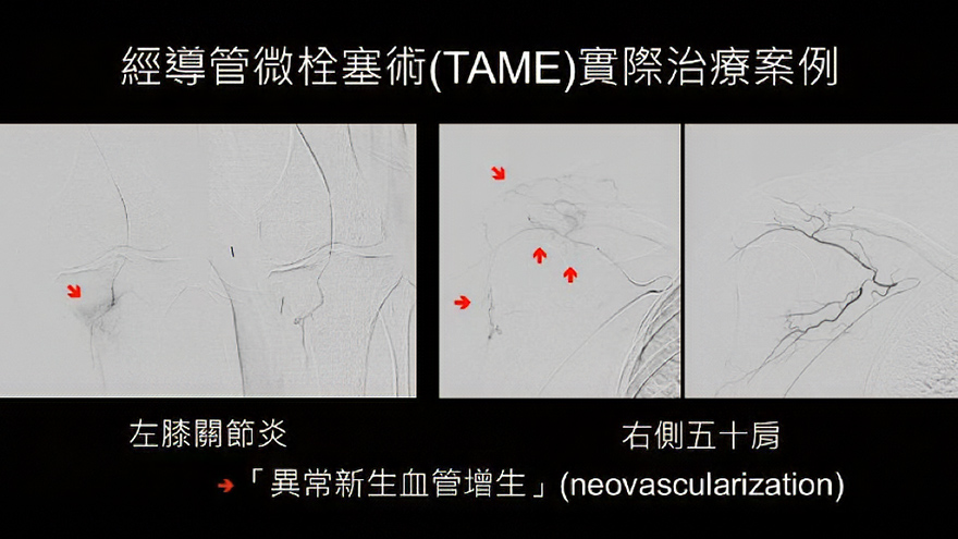 是「精準醫療」,從血管病理的角度去修正疼痛的根源,只需局部麻醉,傷口僅有一個針孔大小,術後恢復迅速。使用的栓塞劑如Imipenem/Cilastatin是一種抗生素結晶,在體內會逐漸溶解,安全性高,發生肌肉骨骼缺血壞死等嚴重併發症的風險極低。隨著臨床證據的累積,TAME將為慢性疼痛提供新的治療選擇,嘉惠合適患者。